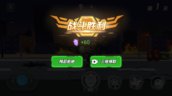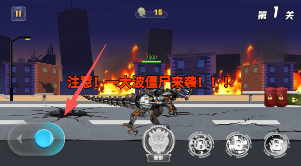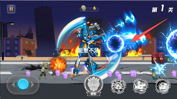 3、攒够能量就按变形键,机甲放出酷炫大招清场,瞬间让僵尸群体验什么叫高科技。