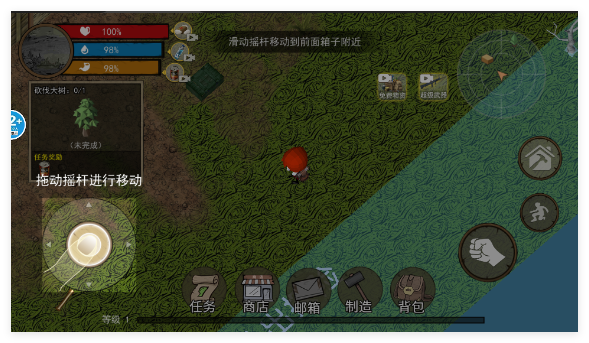 1、进入游戏后,左边可以拖动摇杆进行移动。