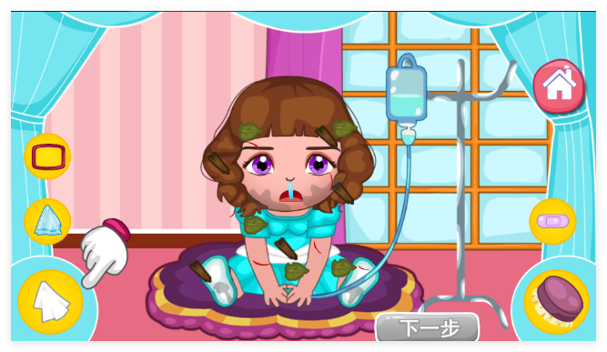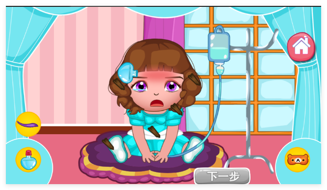 2、按照提示协助处理贝贝的相关状况,在操作中学习防护知识,完成基础就诊环节后,解锁趣味换装功能。