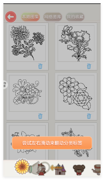 2、涂色资源丰富多元,标签分类清晰,涵盖人物、植物、日常用品等多种图案,135种色彩提供充足创作空间。