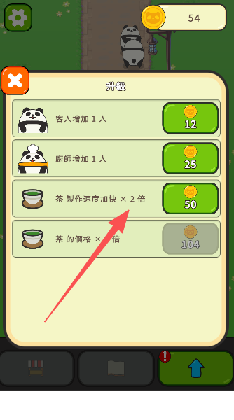 3、点右下角绿色箭头进升级菜单,给“客人+1”项投币,小店立马能多招待一位食客。
