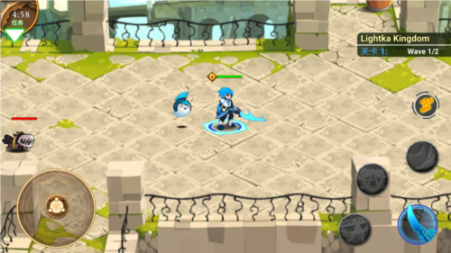 1、从战士、法师等 6 大职业中挑选英雄,按前排肉盾 + 后排输出 + 治疗辅助的思路布阵,利用轮盘控制移动、技能图标释放招式。
