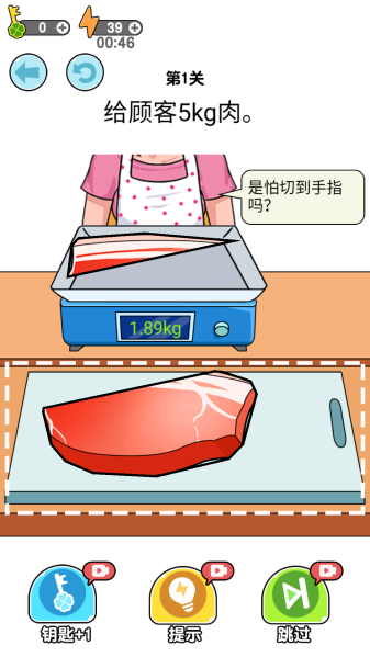 1、点击首页“开始游戏”进入关卡,先观察顾客需求(如指定重量)与砧板上的物品,规划切割思路。