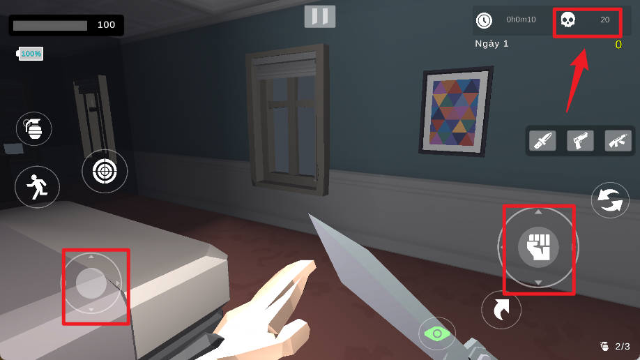 2、通过虚拟摇杆移动角色,点击屏幕转向,利用武器击杀指定数量僵尸。