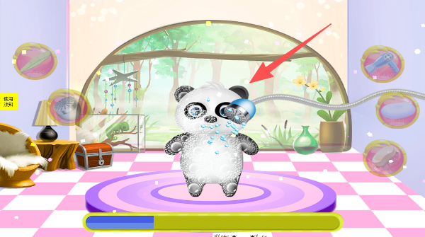2、哎呀,小熊猫玩得满身是泥,快准备好香喷喷的泡泡浴,给它来个彻底的大清洁。