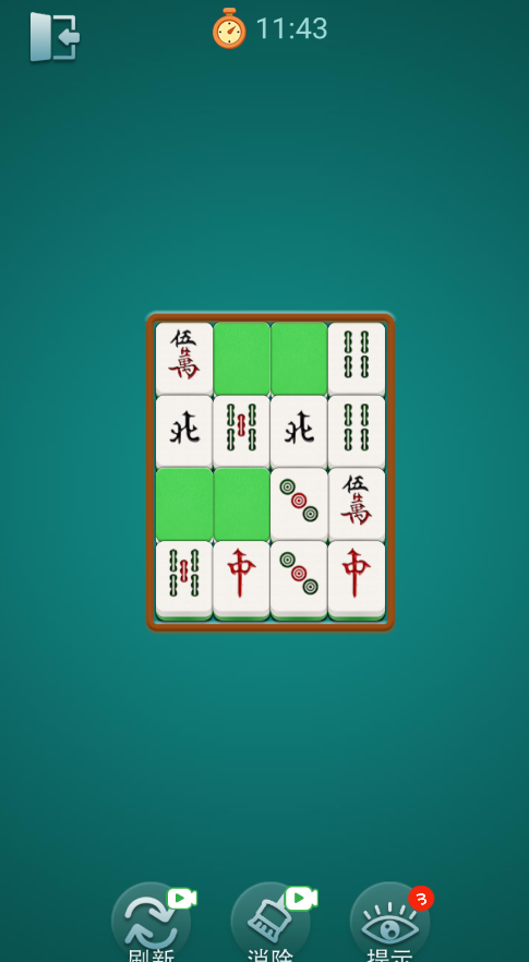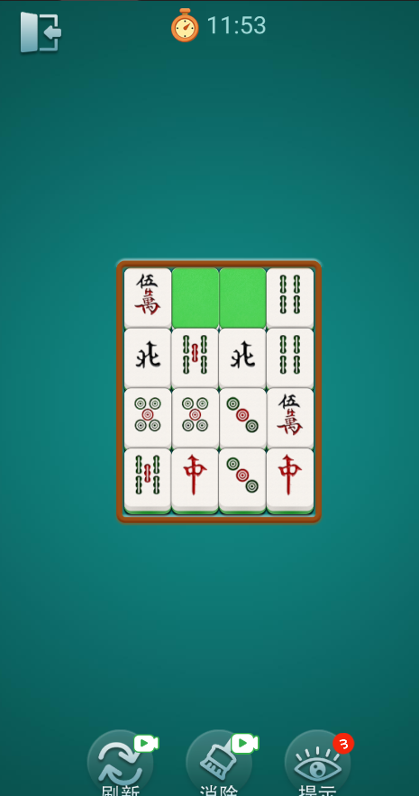 2、相邻且花色、样式完全一致的麻将牌,点击即可直接消除;利用牌面空白区域调整位置,创造相邻消除条件。