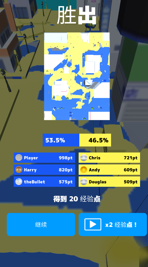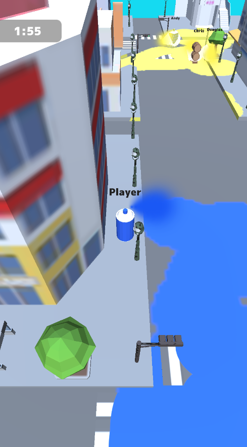 2、核心操作为虚拟摇杆控制移动,点击攻击键喷射颜料,喷涂敌方领地或地面可累积进度,靠近队友喷涂区域能快速恢复生命值。