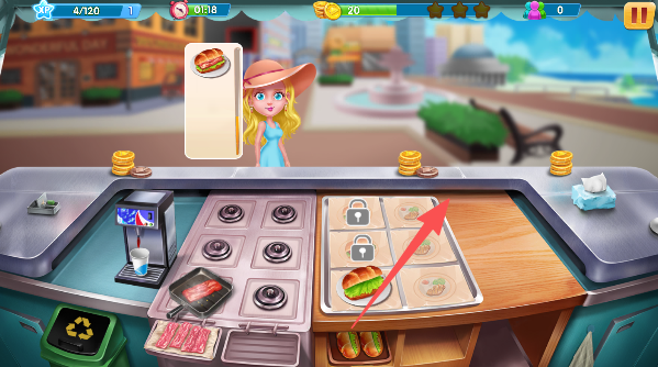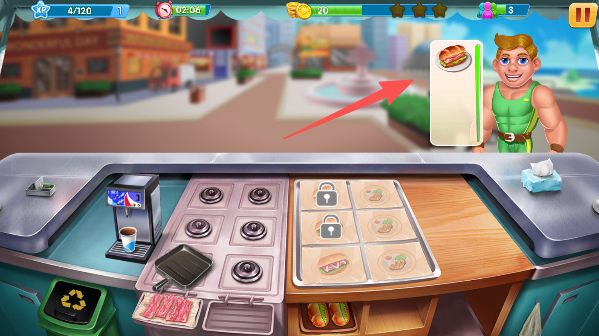 1、先看看顾客想要汉堡还是饮料,动手在料理台做出美味餐点,赚取亮闪闪的金币。