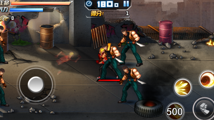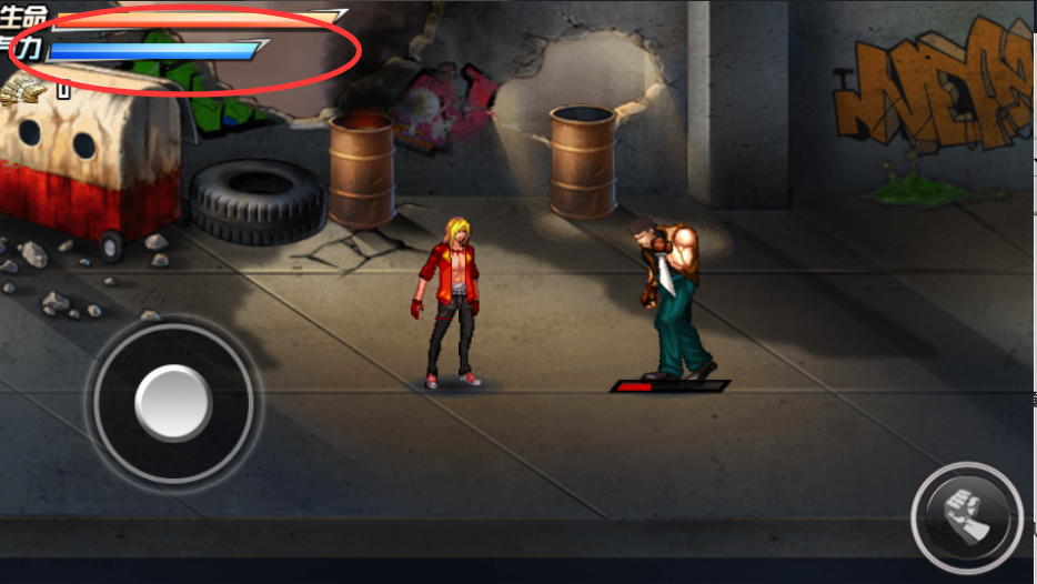 1、熟悉虚拟摇杆移动、按键攻击的操作,注意左上方的生命和气力,避免清零结束战斗。