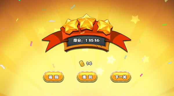 3、分数条蹭蹭涨到顶,立刻弹出通关动画,新关卡的水果大军等你挑战。