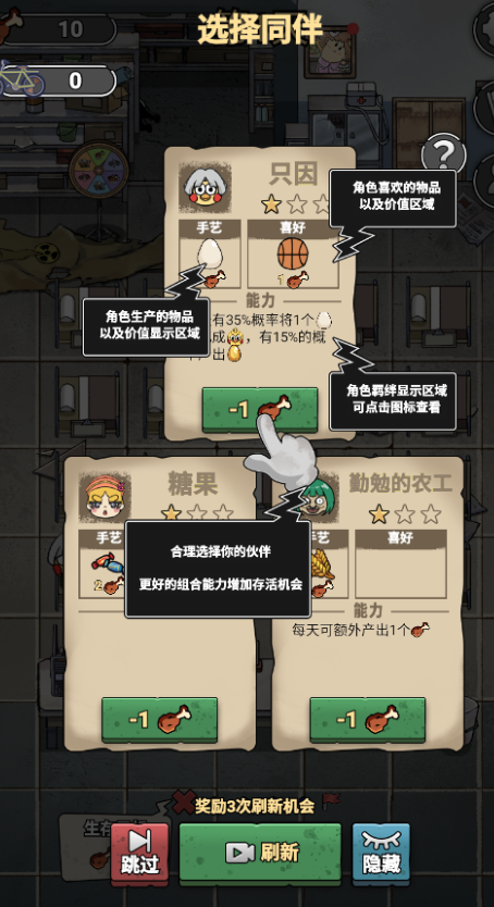 1、操作极简无门槛,核心聚焦伙伴搭配与建筑规划,点击即可完成全部操作,新手也能快速掌握生存技巧。