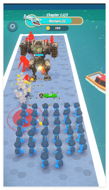 3、指挥强化后的蓝队小兵与红队敌人展开射击对战,灵活运用武器优势攻克关卡,击败最终BOSS,收集金币解锁更多内容。