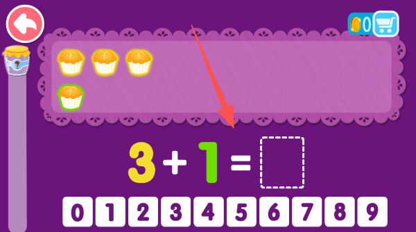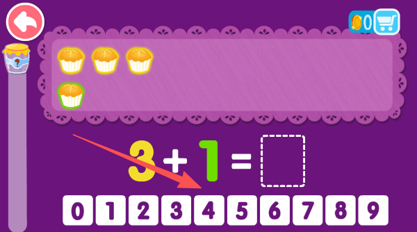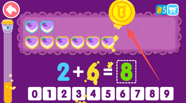 1、将基础加减法题目与卡通游戏场景结合,通过互动操作完成计算学习。