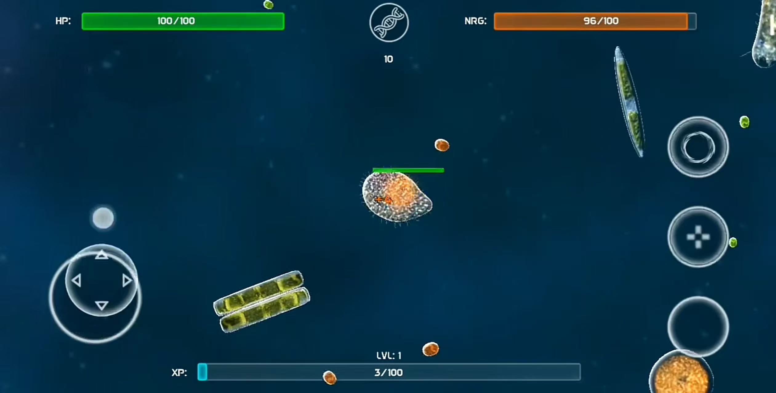 3、利用方向盘操作草履虫吞噬细菌,通过吞噬通关游戏。