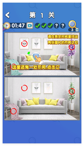 3、在规定时间内找出关卡要求的全部差异点,即可完成挑战顺利通关,解锁难度更高、画面更丰富的全新关卡内容。