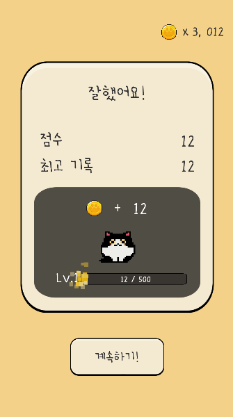 3、每局结束后,在结算画面点“继续”,看着小猫升级、金币变多,越玩越有劲。