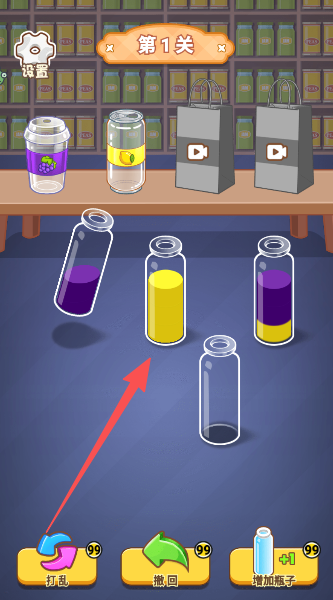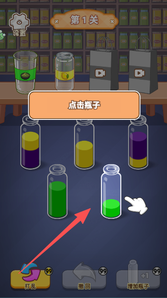 1、看到关卡里五颜六色的瓶子没?点击它,把液体倒进同色的空瓶里,就像给颜色分队伍一样简单。