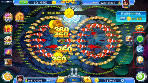 2、海量特色道具免费获取,锁定、定屏、加速等道具各有妙用,合理搭配使用,轻松捕获稀有大鱼,收获满屏金币。