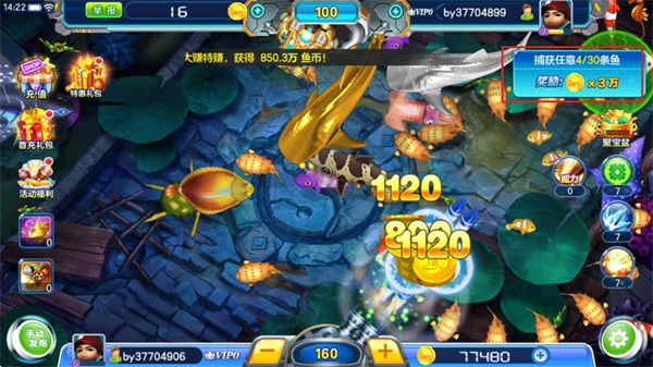 2、操控炮台瞄准游动的鱼类,点击发射炮弹进行捕捉,合理运用锁定、定屏等道具,精准锁定目标,提升大鱼捕获效率。