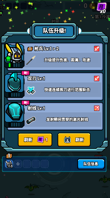 3、击败敌人就可以使队伍升级,可以进行免费刷新一次。