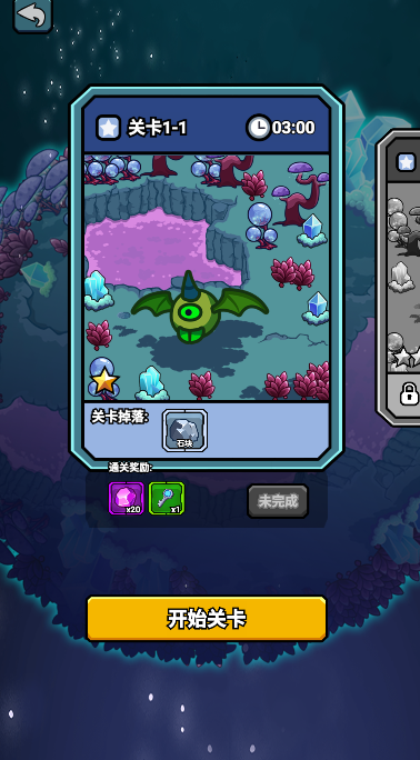 1、进入游戏后先选择关卡1-1。
