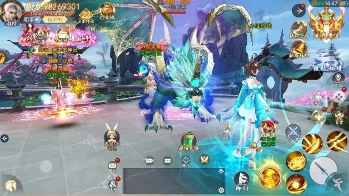 ①突破传统轻功限制,游戏朋友可自由操控12种飞行坐骑进行三维空战。金翅大鹏可发动俯冲击飞,青鸾坐骑自带治疗光环,御剑飞行时能施展"剑雨流星"范围打击。