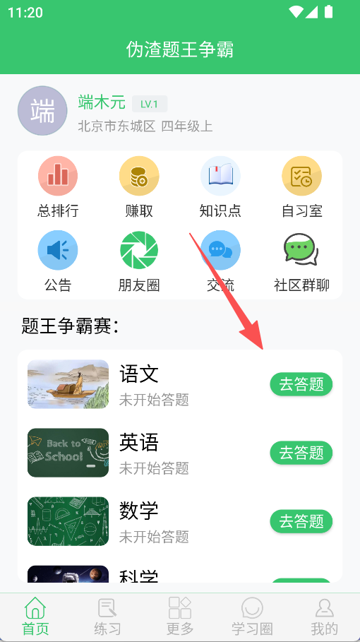 1、在首页“题王争霸赛”中,选择科目点击“去答题”。
