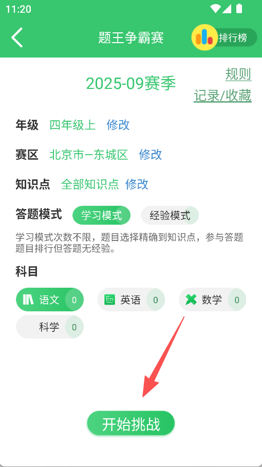 2、进入题王争霸赛页面,设置年级、赛区等信息后点击“开始挑战”。
