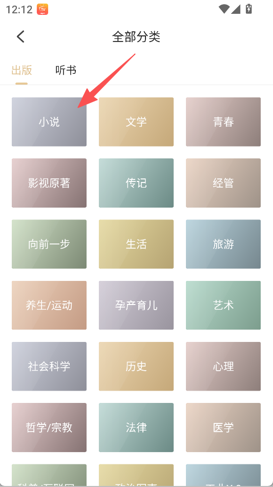 1、在全部分类页面,选择“小说”等书籍分类。