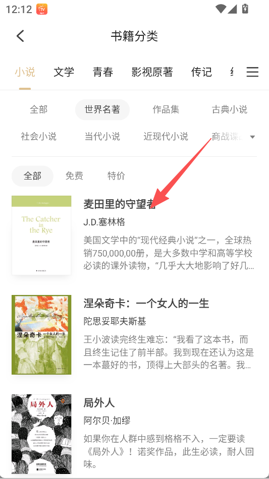 1、支持书籍分类浏览,在全部分类页面可选择小说、文学等类别,进入对应分类列表查看相关书籍。