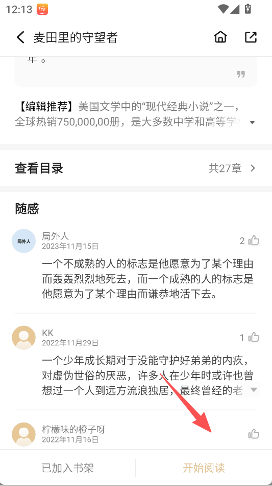 2、设置读者随感板块,在书籍详情页可查看他人阅读感悟,还能参与交流,让阅读过程更具互动性。