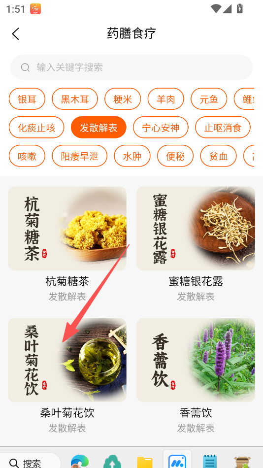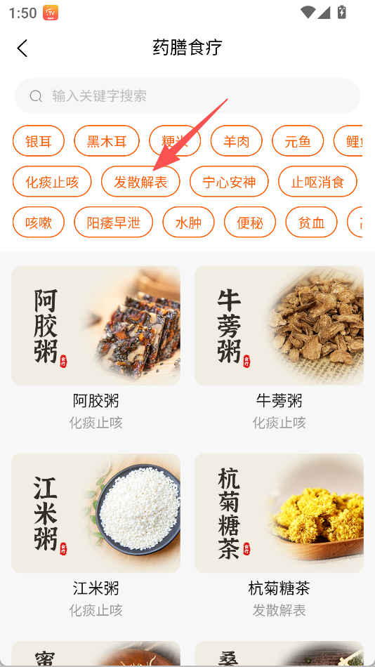 1、进入药膳食疗板块,点击“发散解表”等功效标签,筛选出对应食疗方。