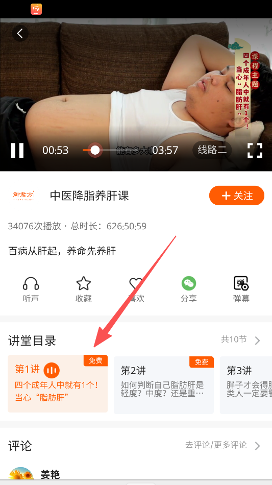 2、支持健康课程播放功能,进入中医降脂养肝课等课程界面,可选择具体章节,点击后即可播放课程视频。