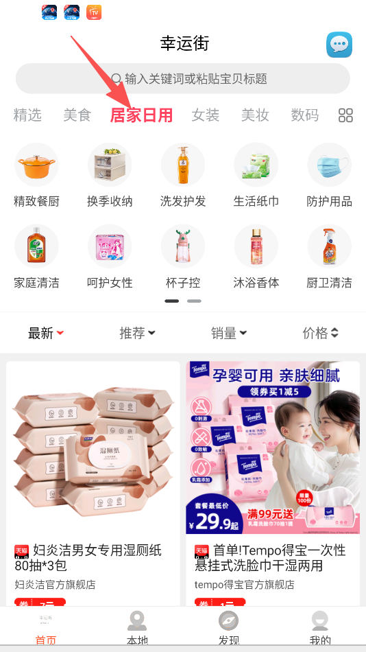 1、进入幸运街首页,选择居家日用等分类,点击洗发护发这类目标品类。