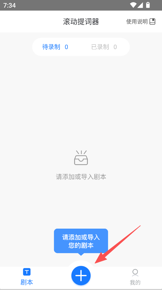 1、打开滚动提词器,点击底部“+”按钮,进入添加剧本页面。