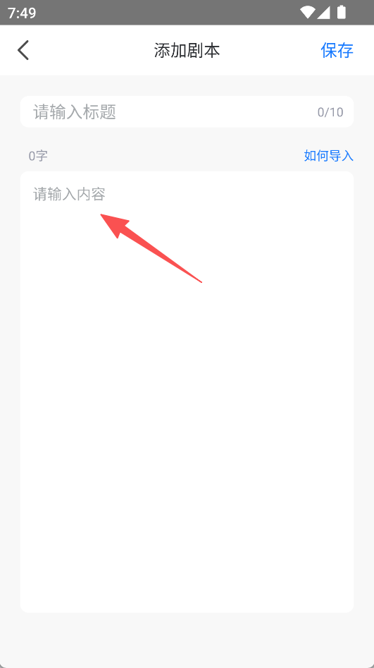2、在添加剧本页面,输入标题和内容,点击保存,完成剧本添加。