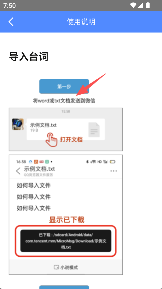 3、也可查看使用说明,将Word或TXT文档导入软件,作为提词剧本。