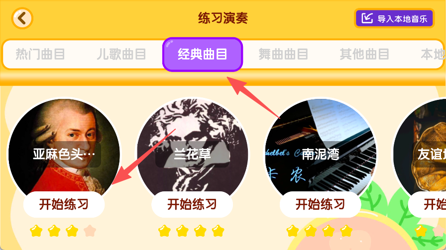 3、曲目选择便捷高效,各类曲目分类清晰,标签醒目,能快速找到想练习的曲目,即刻开始弹奏。