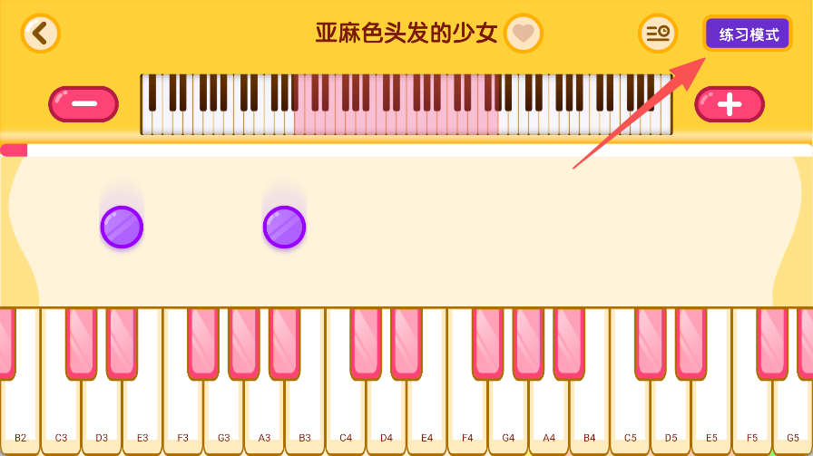 2、在曲目弹奏界面,点击练习模式,跟随提示弹奏钢琴。