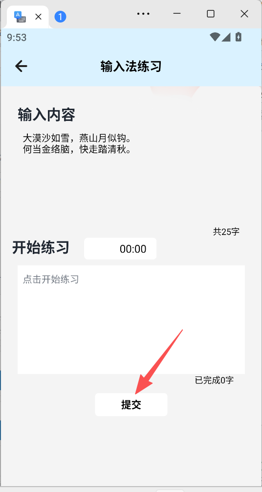 1、进入输入法练习页面,查看输入内容,开始练习输入文字,完成后点击提交。