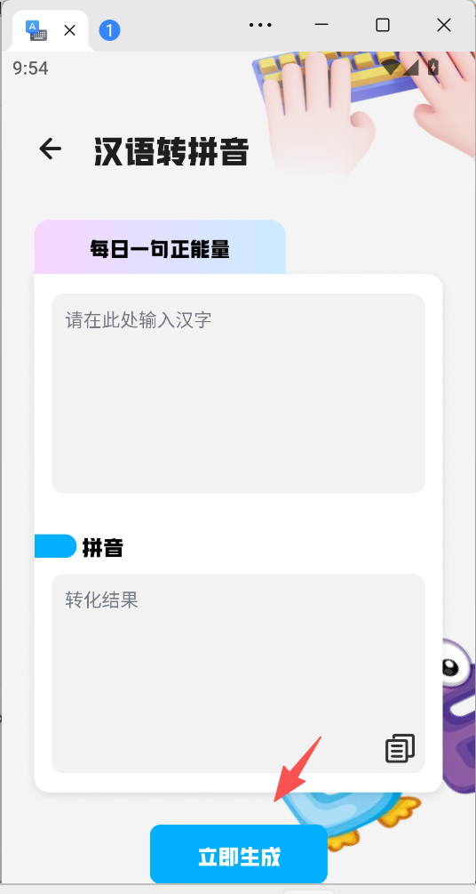 2、在汉语转拼音模块,输入汉字,点击立即生成,获取拼音转化结果。
