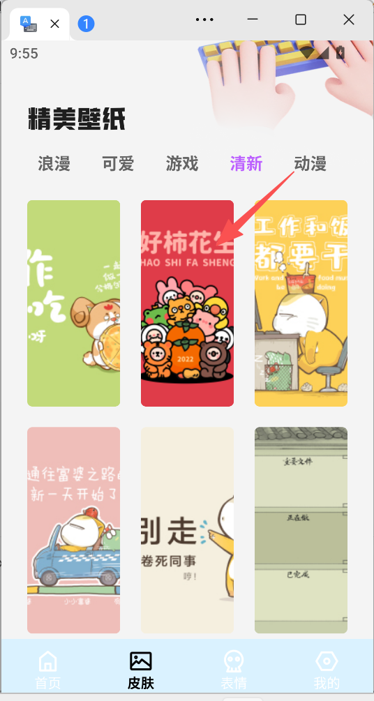 3、支持皮肤设置功能,进入皮肤页面选择风格分类,点击心仪壁纸即可应用,改变输入界面的外观样式。