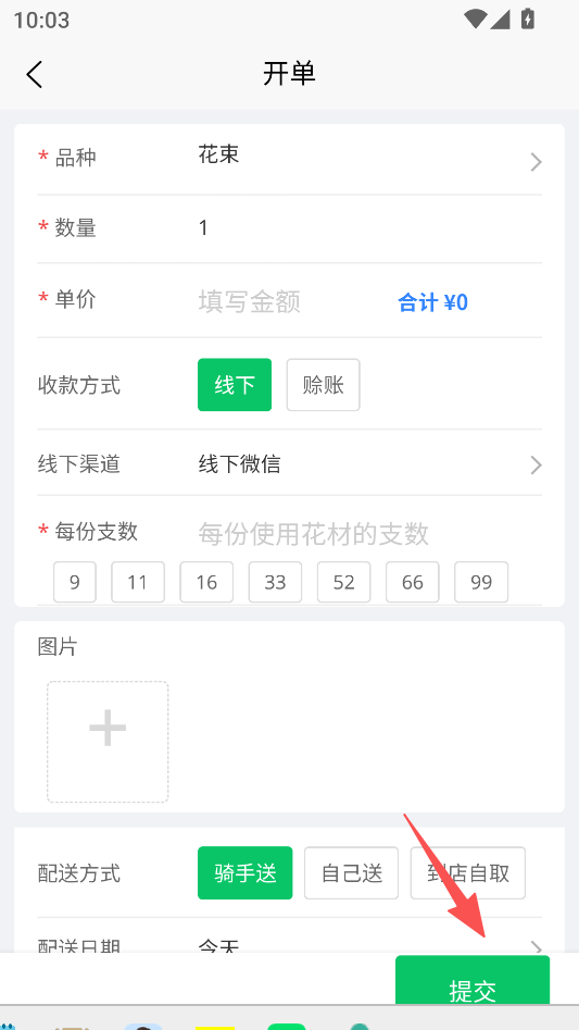 1、进入开单页面,填写品种、数量、单价等信息,选择收款和配送方式,点击提交。