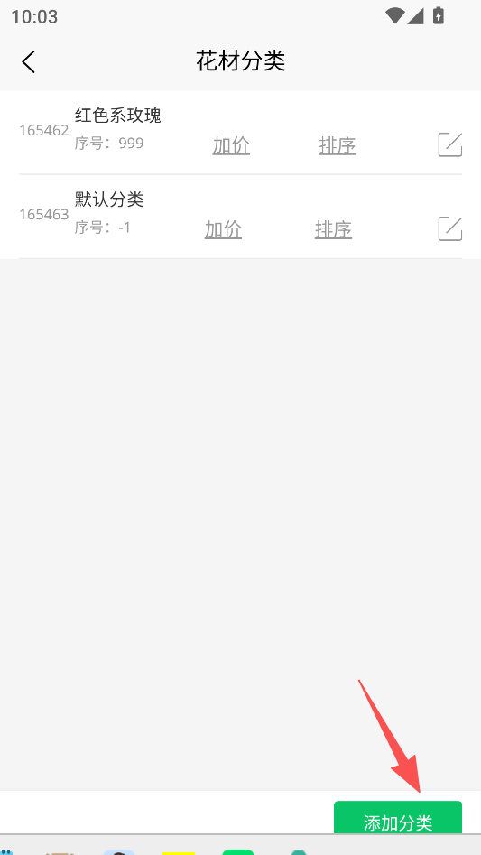 2、进入花材分类页面,点击添加分类,新增花材分类。