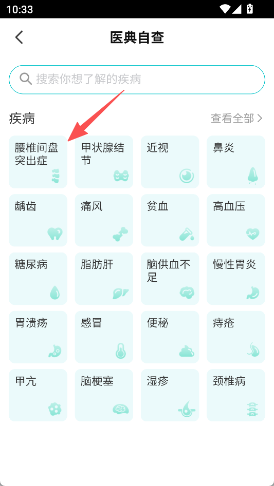 1、在医典自查页面,选择疾病(如腰椎间盘突出症)。