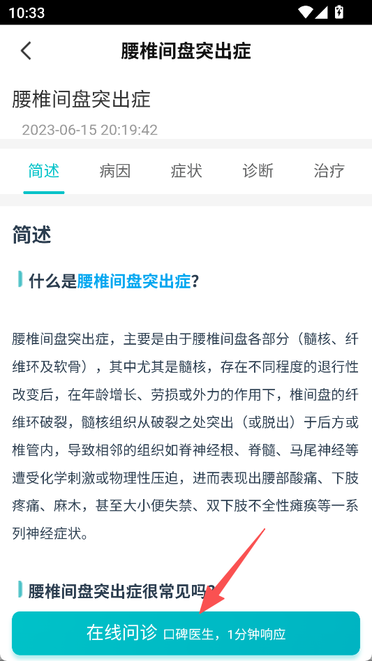 2、进入疾病详情页,点击在线问诊。