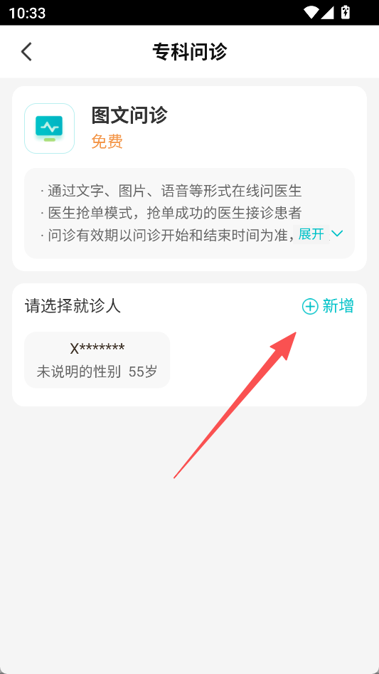 3、提供专科问诊功能,包含图文问诊等形式,可点击“新增”添加就诊人,选择就诊人后向医生提交健康咨询需求。