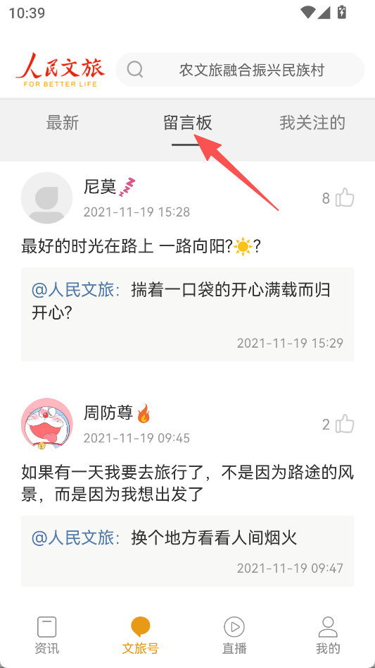 3、进入文旅号板块,点击留言板查看或参与交流。