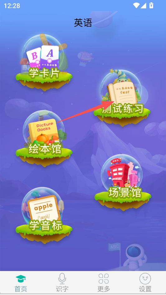 1、提供多模块英语学习入口,包含学卡片、测试练习、绘本馆、场景馆、学音标,点击相应模块可进入对应学习场景。