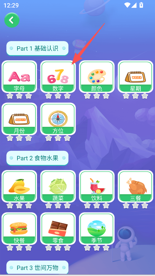 2、分类逻辑贴合儿童认知规律,从基础认识到食物水果再到世间万物,按照儿童易接受的顺序划分学习内容。